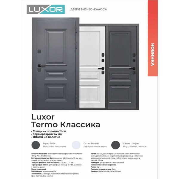 - Надежная, качественная, входная дверь «Люксор-Муар-Классика» будет не только надежным и верным защитником Вашего дома или дачи, но и несомненно украсит парадный вход! Эту замечательную, металлическую дверь, как и многие другие модели, Вы сможете выбрать и оценить на нашем сайте «yalta-stroy.ru» или в нашем магазине в городе Ялта, на улице Блюхера 22а. Будем рады видеть Вас в нашем магазине!